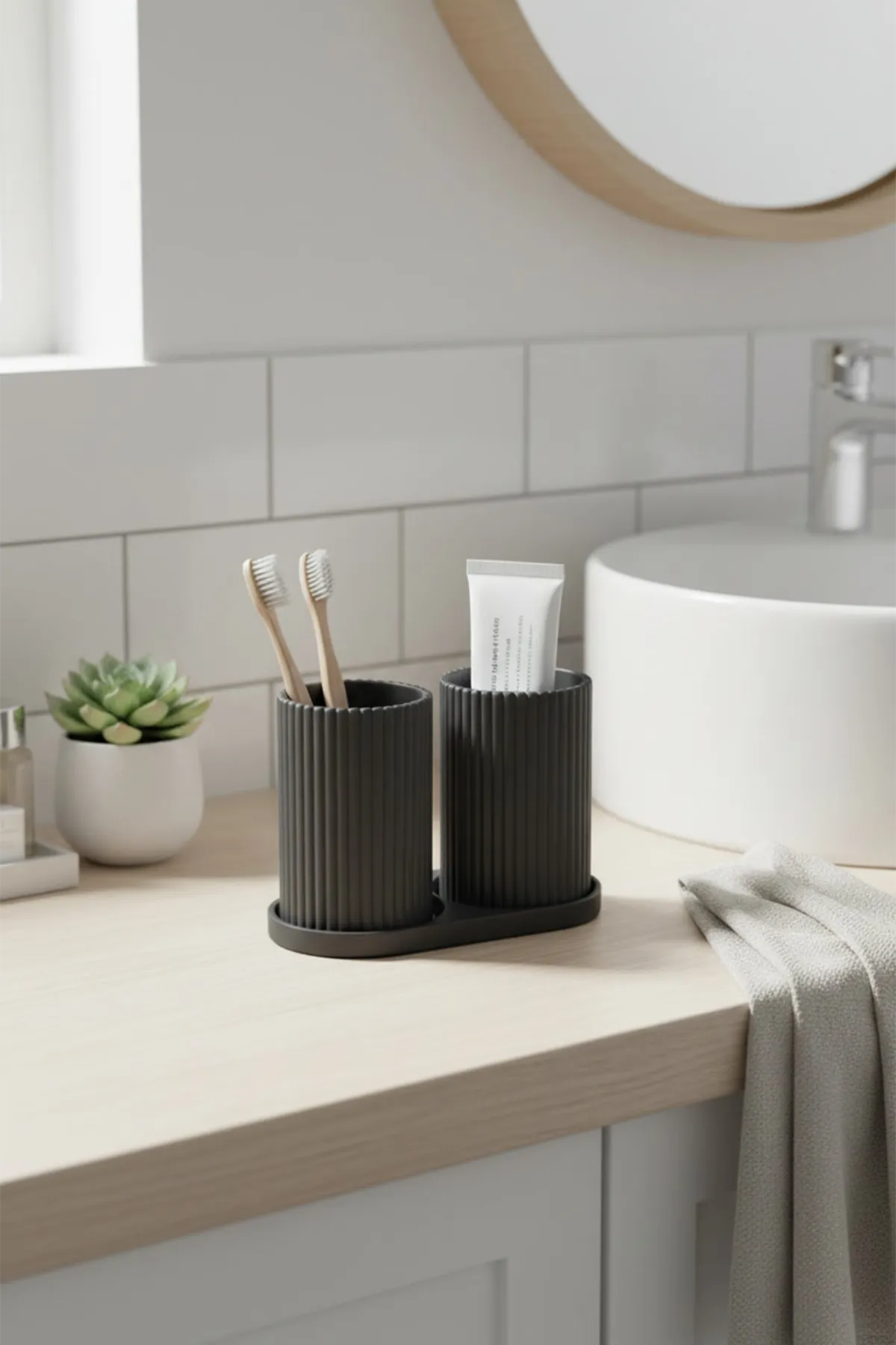 Su diseño cilíndrico con textura estriada y base integrada transmite una estética moderna, limpia y sofisticada, ideal para baños minimalistas, nórdicos o de estilo industrial. No es solo un accesorio práctico, es un elemento decorativo que eleva visualmente el espacio.